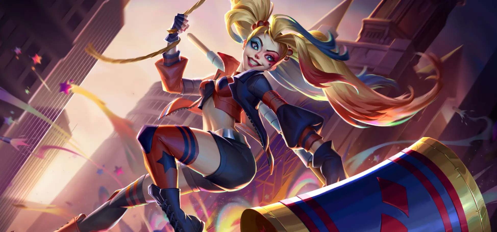 Summons a stage on the battlefield that she steps on, clobbering all enemies 4 times with her mallet and dealing Physical Dmg equal to 20% of Attack each time. After casting, if HP is less than 60%, she'll take out a can of spray paint to change her HP bar, healing herself for 15% of max HP.